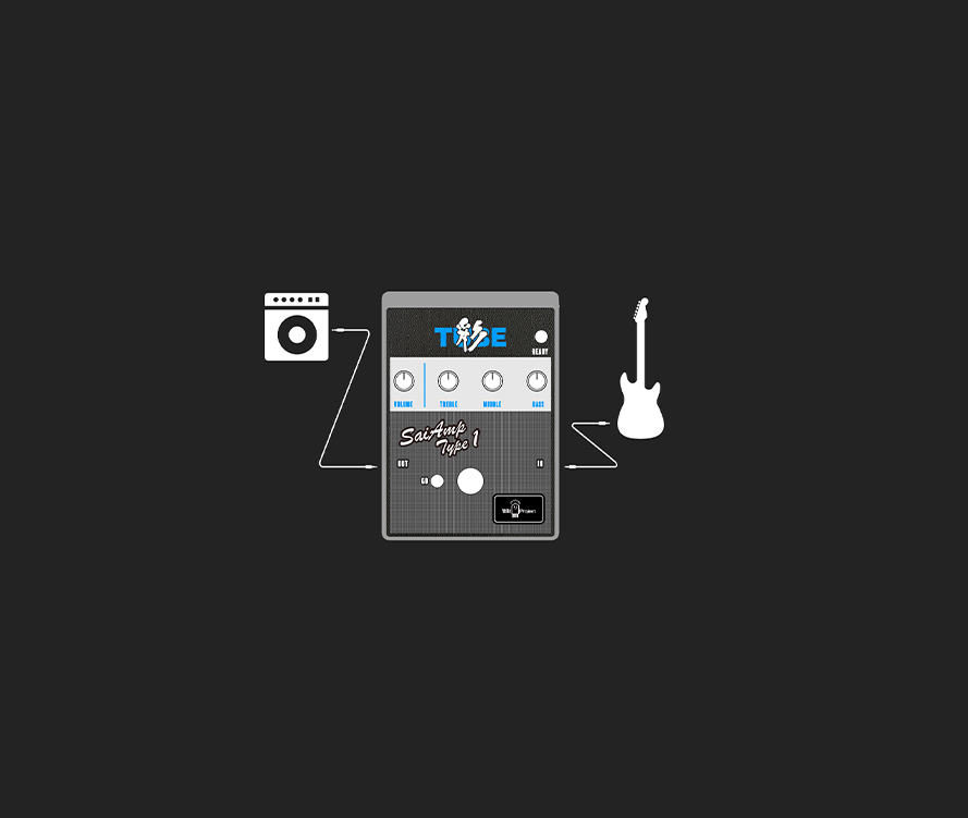 ギターアンプの入力ジャックにプラグイン。ギターアンプ本体でメインの音作りを行い、彩アンプ TYPE I の3バンド EQ とボリュームで調整してサウンドを仕上げます。